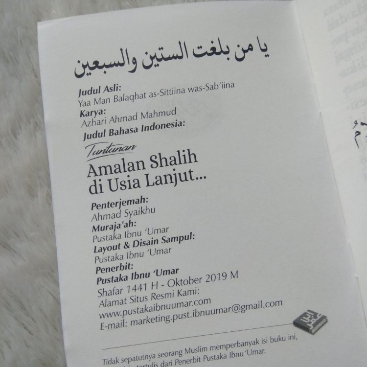 Buku ini yang membahas dengan mudah tentang tuntunan amalan- amalan yang dilakukan di masa tua. Semoga shalawat serta salam senantiasa Allah limpahkan kepada Nabi Muhammad shallallaahu ‘alaihi wa sallam, dan juga keluarganya, serta para Shahabatnya yang mulia semuanya.