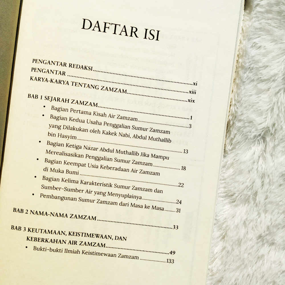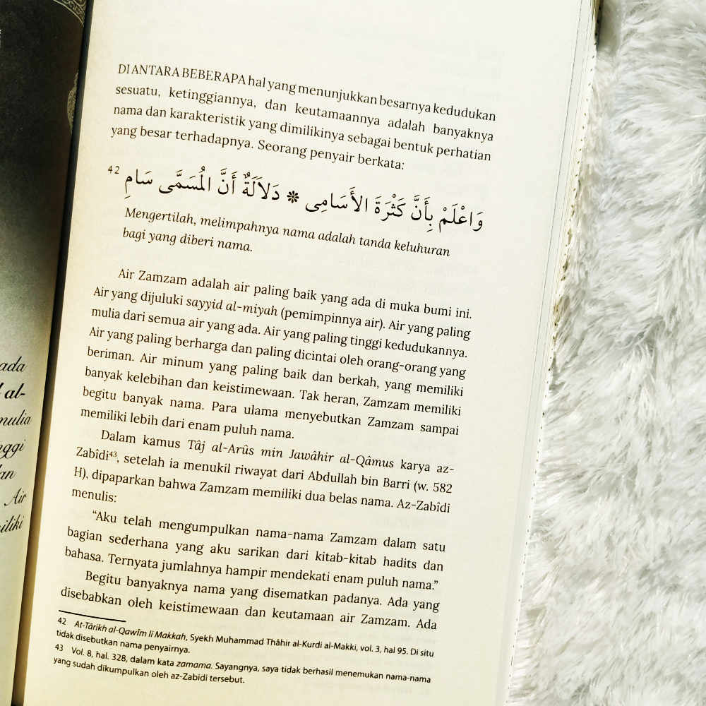 Buku ini menyuguhkan berbagai informasi menarik yang Anda butuhkan tentang Zamzam. Sejarah masa lalu, nama-nama, keistimewaan, adab, khasiat, hukum fikih, sampai syair-syair tentang air Zamzam terangkum lengkap dalam buku ini. Puluhan buku ditulis untuk menjelaskan keistimewaan dan sejarah air Zamzam. Namun, buku yang ada di tangan ,Anda ini bisa disebut sebagai salah satu karya paling lengkap tentang Zamzam yang pernah ditulis.