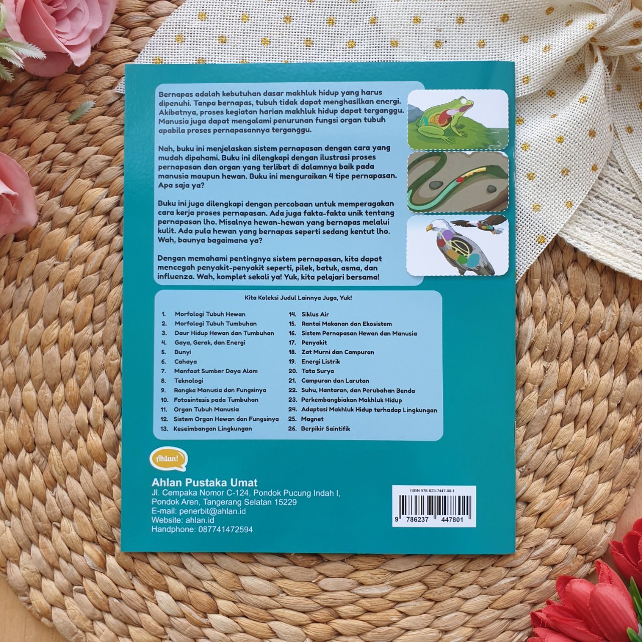 Buku ini mengangkat pentingnya bernapas sebagai kebutuhan dasar makhluk hidup. Tanpa proses pernapasan, tubuh tidak dapat menghasilkan energi, mempengaruhi aktivitas harian, dan dapat menurunkan fungsi organ tubuh. Dengan bahasa yang sederhana, buku ini menjelaskan sistem pernapasan beserta ilustrasi proses dan organ yang terlibat, baik pada manusia maupun hewan.