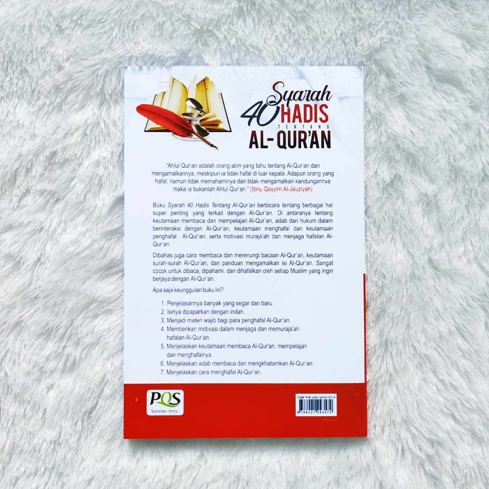 Buku Syarah 40 Hadis Tentang Al-Qur’an berbicara tentang berbagai hal super penting yang terkait dengan Al-Qur’an. Di antaranya tentang keutamaan membaca dan mempelajari Al-Qur’an, adab dan hukum dalam berinteraksi dengan Al-Qur’an, keutamaan menghafal dan keutamaan penghafal Al-Qur’an, serta motivasi muraja’ah dan menjaga hafalan Al-Qur’an.