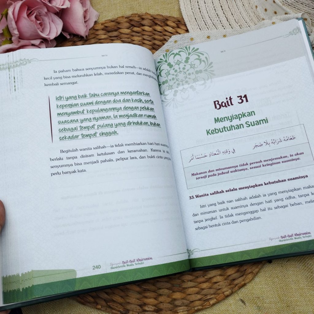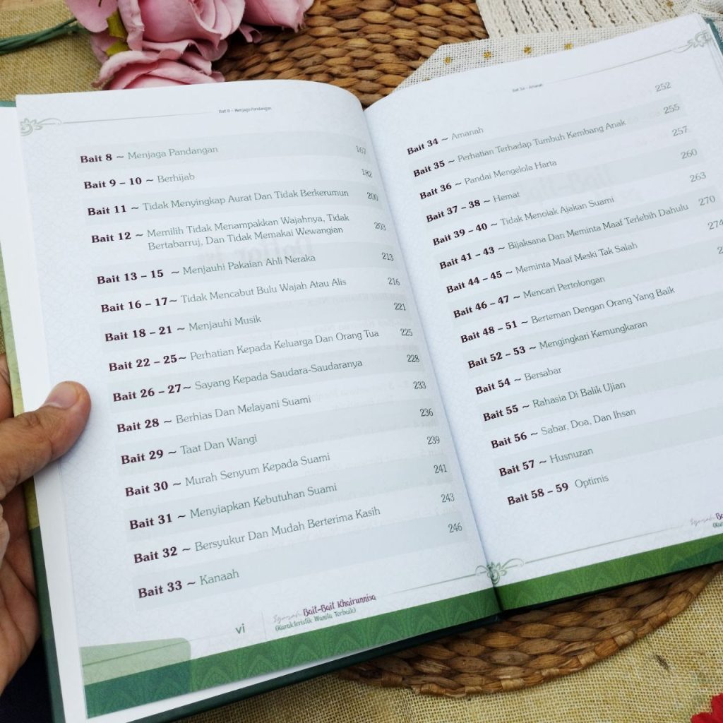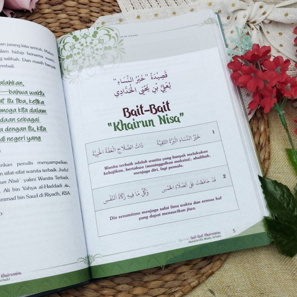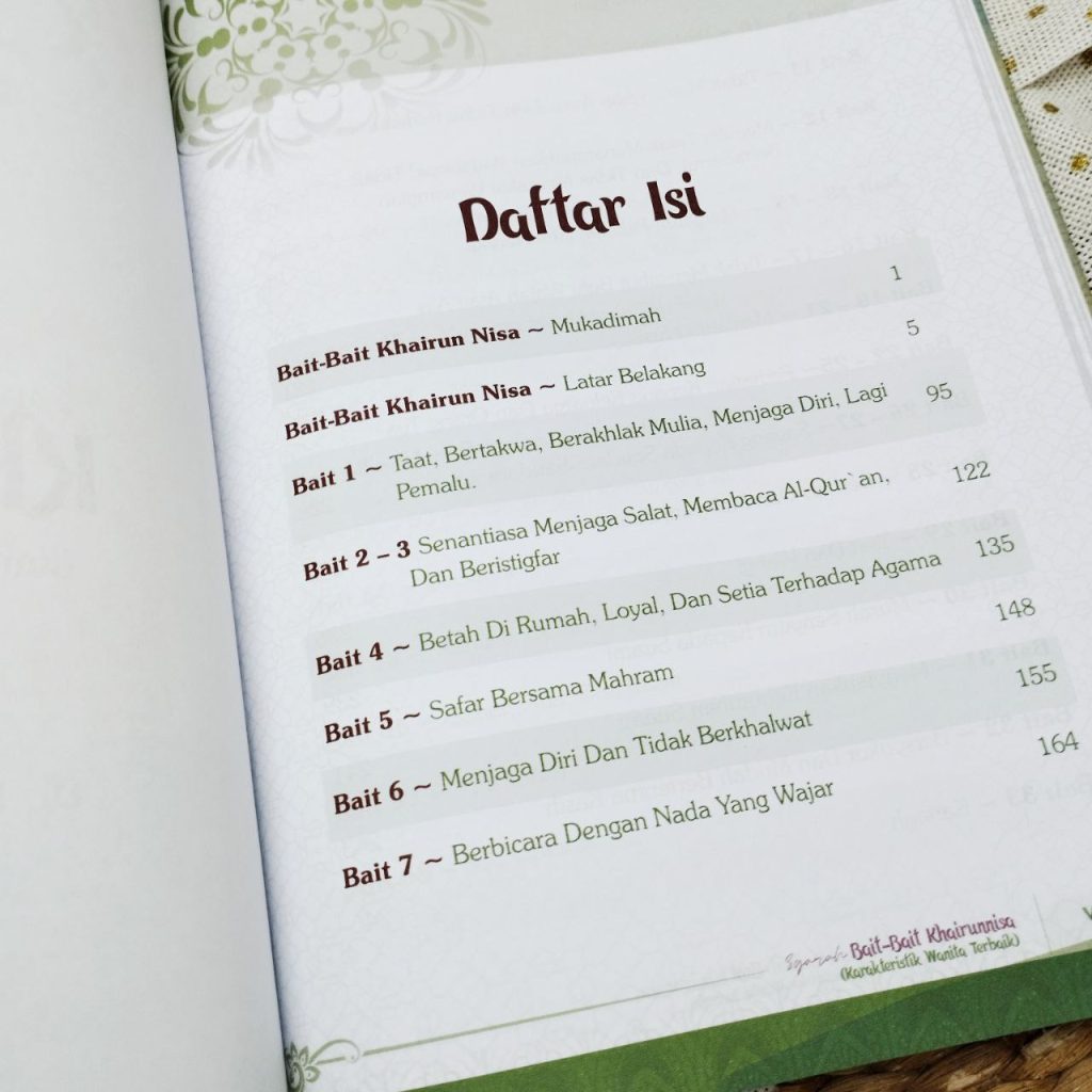 Buku Syarah Bait-Bait Khairunnisa (Karakteristik Wanita Terbaik) mengajak setiap muslimah untuk kembali mengenal jati dirinya sebagai hamba Allah. Disusun dari penjelasan bait-bait syair indah berjudul Khairun Nisa’ karya Dr. Ali bin Yahya al-Haddadi, seorang dosen di Universitas Islam Muhammad bin Saud, Riyadh — buku ini menuntun pembaca memahami sifat-sifat wanita shalihah, lembut hatinya, kuat imannya, dan indah akhlaknya.