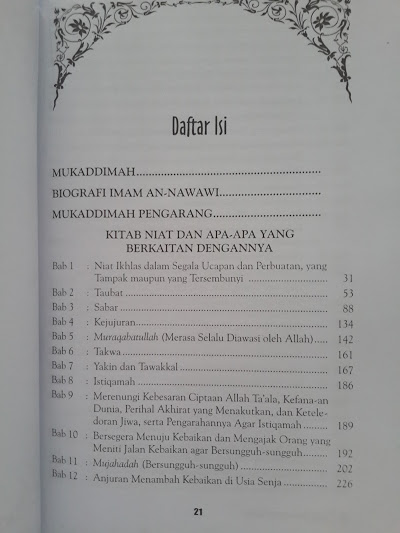 Sesungguhnya segala puji bagi Allah semata pemilik semesta alam. Buku ini berisi hadits-hadits tentang ibadah, muamalah, akidah dan lain-lain, yang ditulis oleh Imam An-Nawawi kemudian disyarah oleh Syaikh Ibnu Al-‘Utsaimin, berikut di antara isinya:
