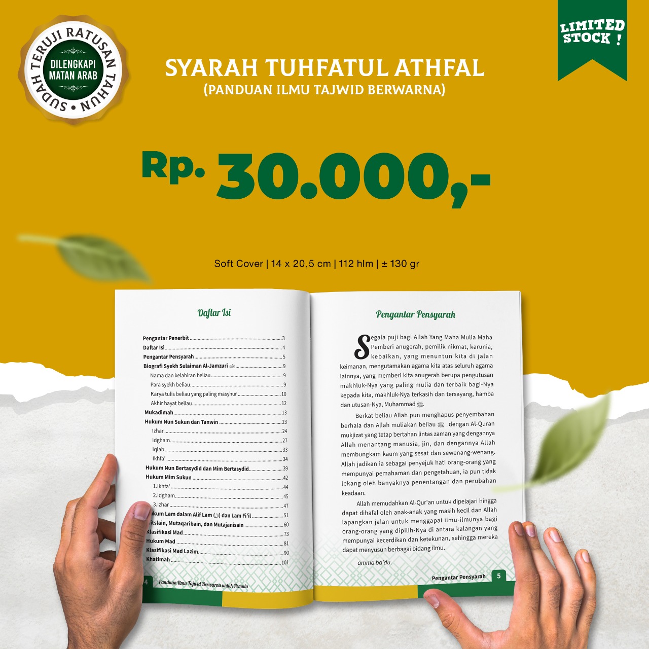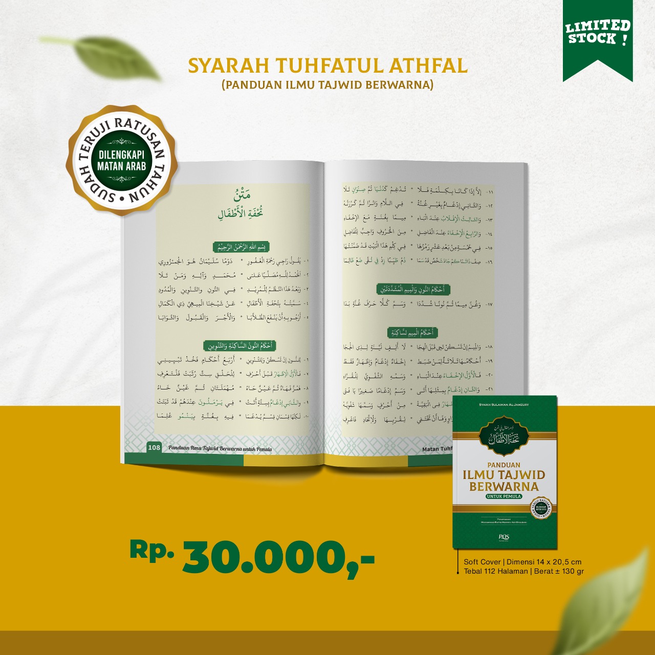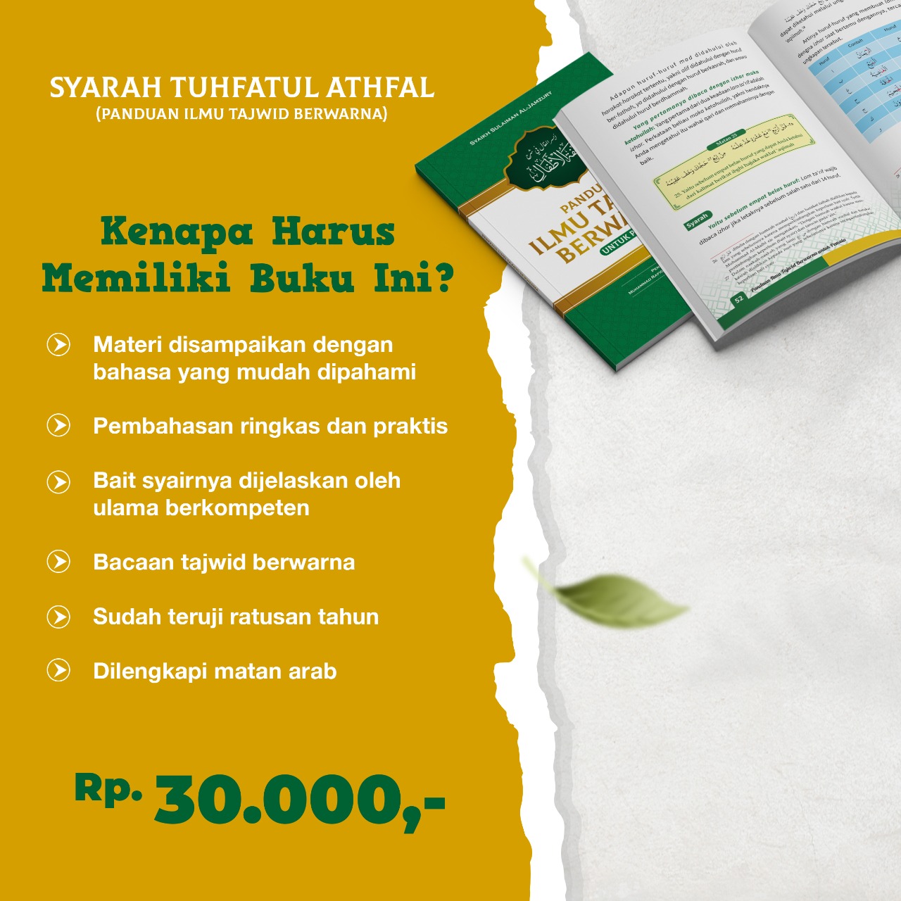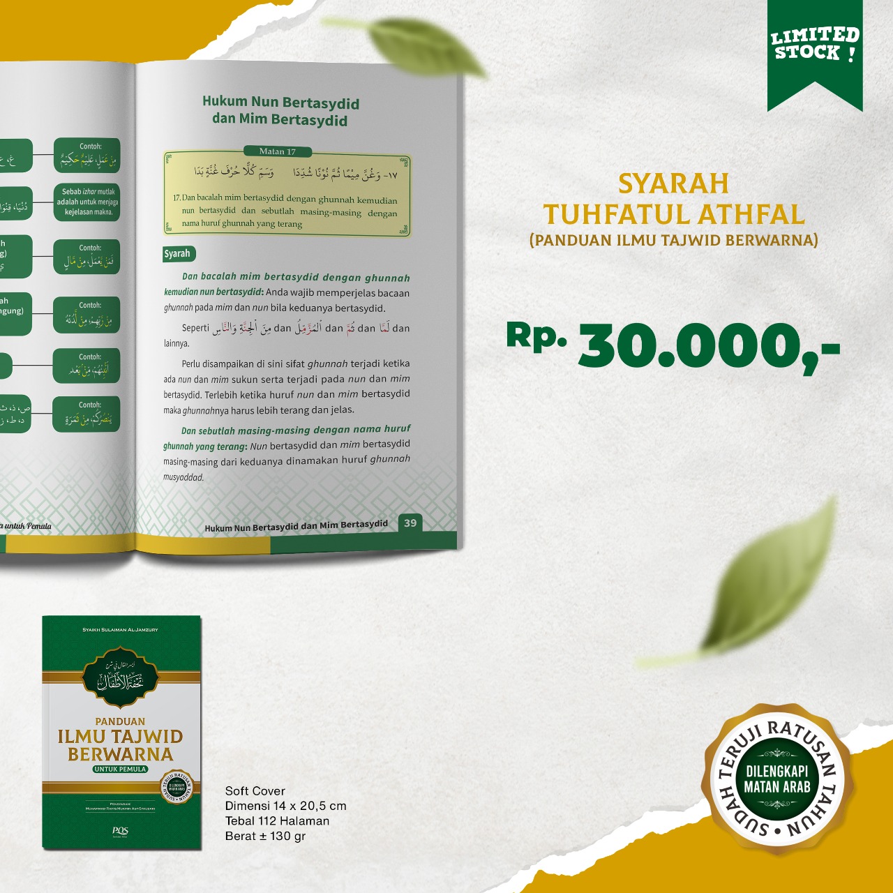 Telah hadir buku Panduan Ilmu Tajwid Berwarna (Syarah Tuhfatul Athfal) solusi bagi anda yang ingin belajar ilmu tajwid secara mudah dan jelas. Buku ini berisi kumpulan matan syair tentang ilmu tajwid yang telah disyarah dan dijelaskan oleh ulama, sehingga tak perlu dikhawatirkan terjadi kesalahpahaman terhadap maksudnya.