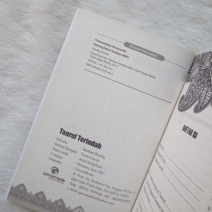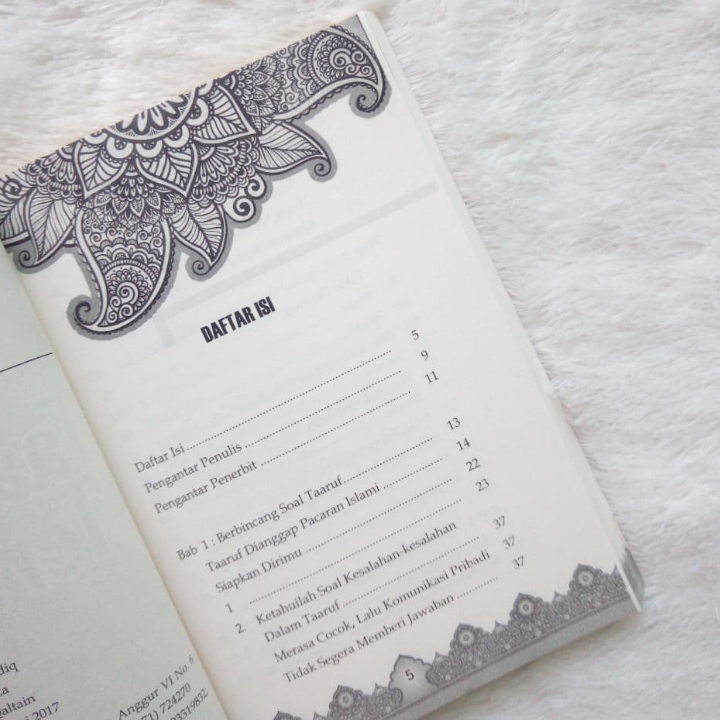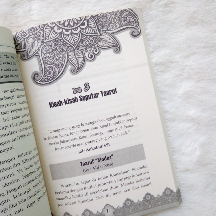 Buku ini “Buku Taaruf Terindah Menuju Pernikahan Barokah” , Buku ini membahas soal bagaimana menyiapkan hati dalam melakukan proses ta’aruf. Apa saja kendala dalam Ta’aruf, lalu bagaimana kesalahan-kesalahan yang akan ditemui dalam praktek ta’aruf.