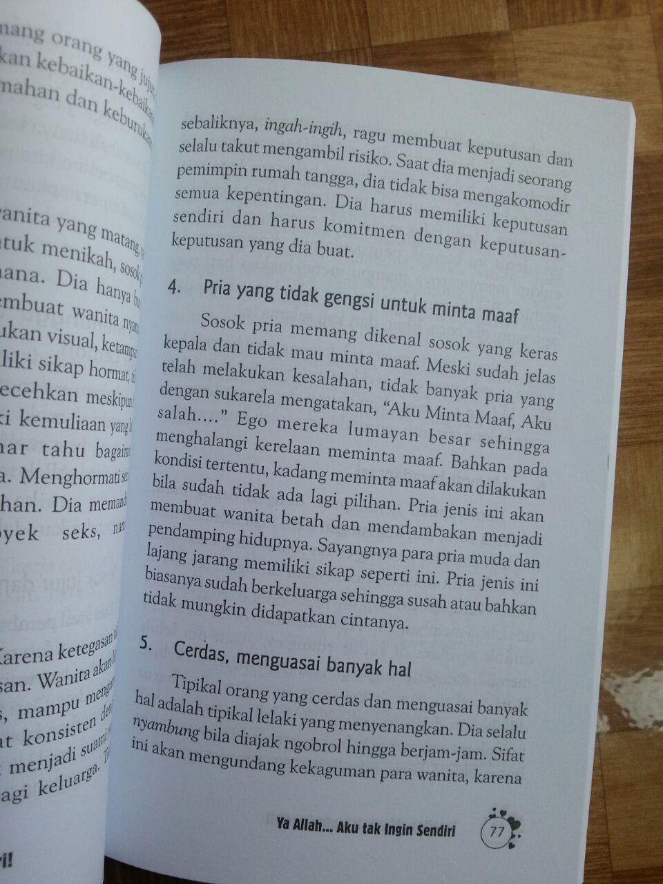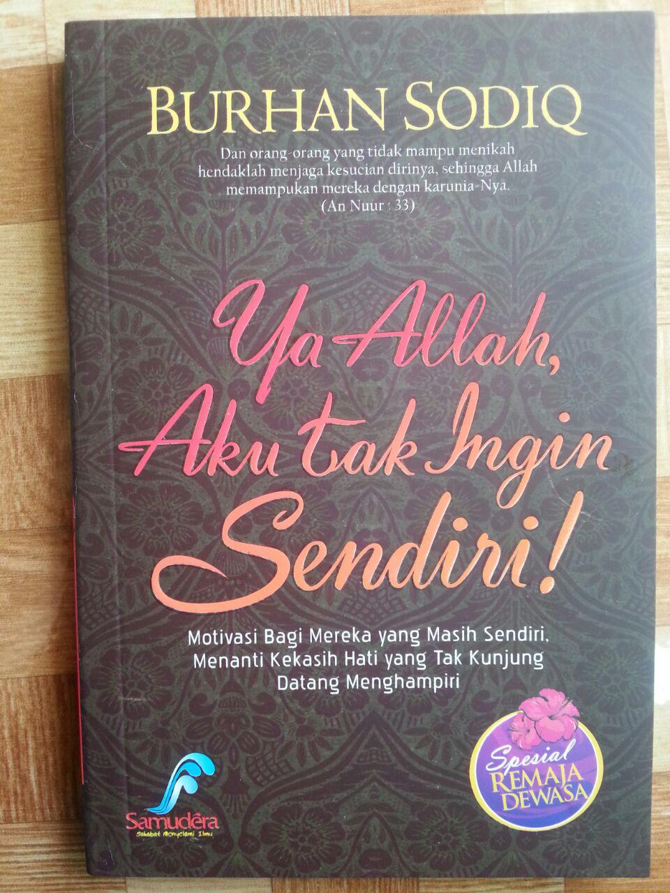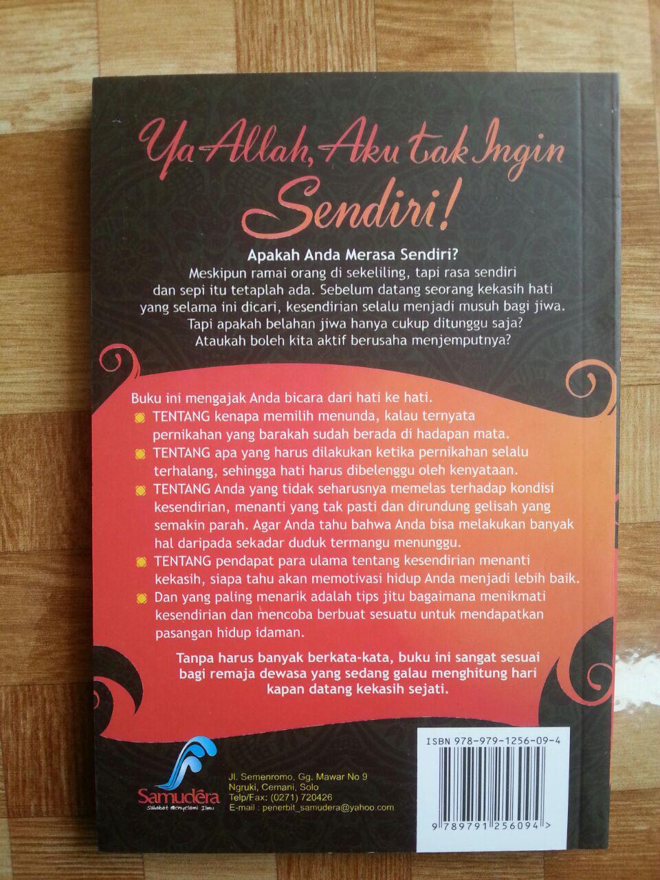 Apakah Anda Merasa Sendiri? Meskipun ramai orang di sekeliling, tapi rasa sendiri dan sepi itu tetaplah ada. Sebelum datang seorang kekasih hati yang selama ini dicari, kesendirian selalu menjadi musuh bagi jiwa. Tapi apakah belahan jiwa hanya cukup ditunggu saja? Ataukah boleh kita aktif berusaha menjemputnya? Buku “Ya Allah, Aku Tak Ingin Sendiri” ini mengajak Anda berbicara dari hati ke hati. Tentang kenapa memilih menunda, kalau pernikahan yang barakah sudah berada di hadapan.