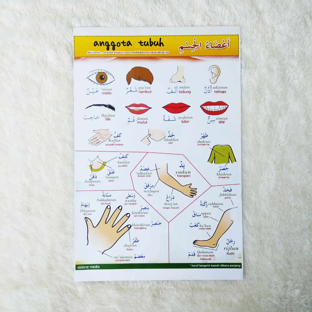 Alhamdulillah kini sudah hadir “Poster Anggota Tubuh Arab Indonesia” poster ini menampilkan nama-nama anggota tubuh dengan bahasa arab untuk anak-anak yang mudah dipahami dan bagus untuk diletakkan pada di rumah, mading masjid, dll.