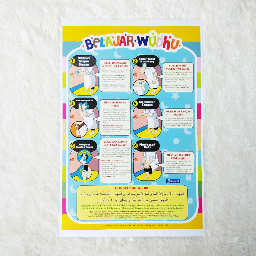 Alhamdulillah kini sudah hadir “Poster Belajar Wudhu” poster ini menampilkan tata cara belajar wudhu untuk anak-anak dengan penjelasan yang singkat sehingga mudah dipahami dan bagus untuk diletakkan pada di rumah, mading masjid, dll.