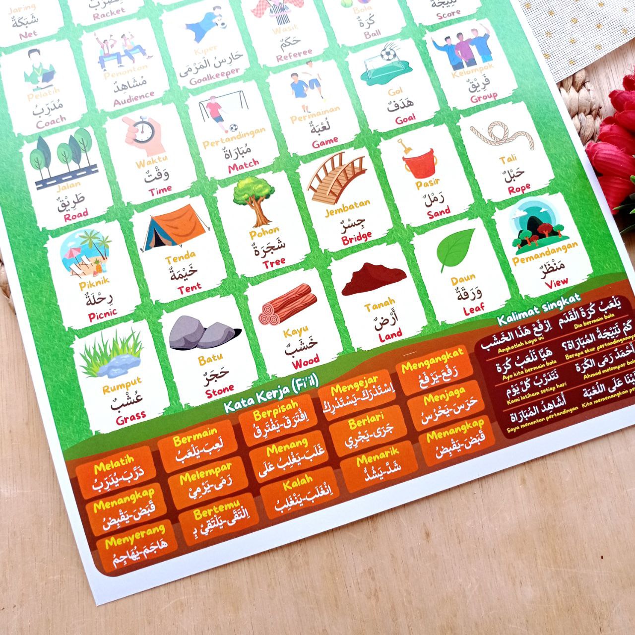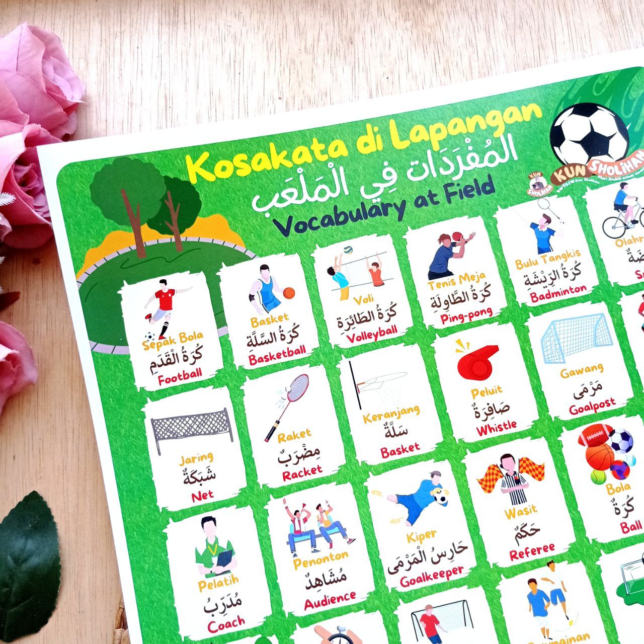 Mari ajarkan anak-anak kita kosakata bahasa Arab dengan cara yang menyenangkan! Poster ini dirancang khusus untuk membantu mereka belajar kosakata yang berkaitan dengan apa yang ada di lapangan dalam bahasa Arab dan bahasa Inggris secara bersamaan.